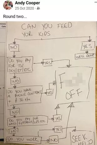 It was obvious in 2020 that Andrew Cooper’s destiny was to be a Tory MP. In a Facebook post he does the typical Tory trick of victim blaming poor people and demonstrating a total lack of understanding the circumstances surrounding poverty. In a flow chart he tells parents who can’t feed their children but have things such as mobile phone contracts or who do not have jobs to ‘fuck off’.